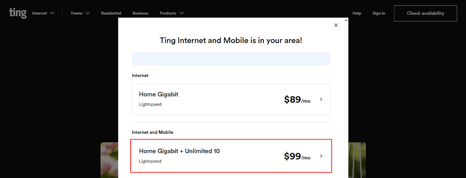 - Select the Home Gigabit + Unlimited 10 for $99 to sign up for the Ting Unlimited combo