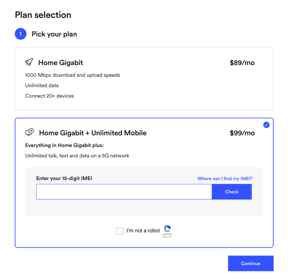 - Select the Home Gigabit + Unlimited 10 for $99