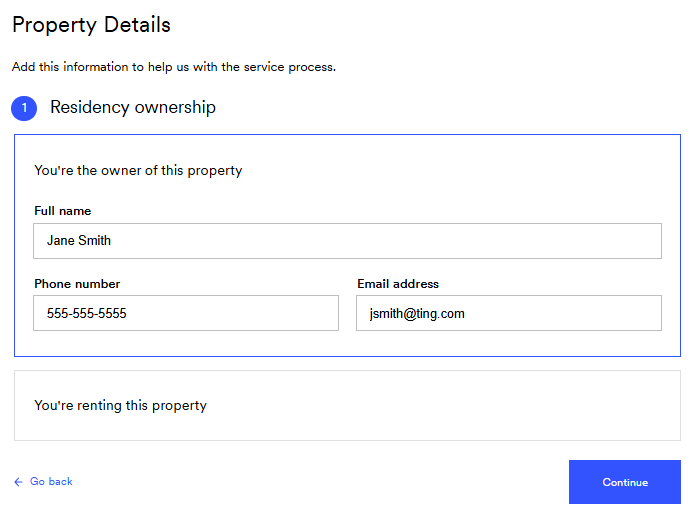 - If you rent, select You’re renting this property and enter your landlord’s contact information. We need the property owner’s permission before installing fiber.