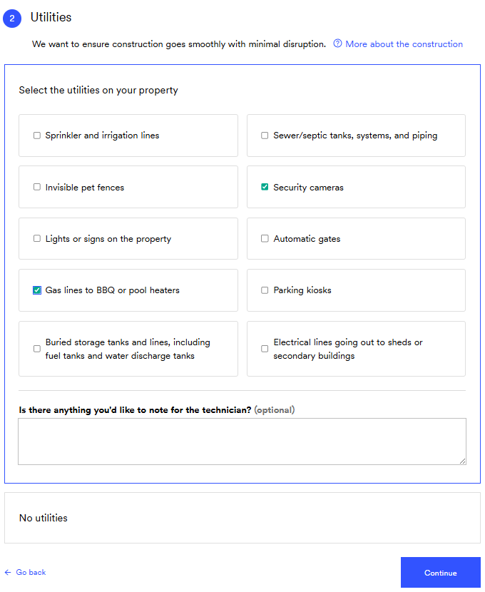 - You’ll be asked to check off any private utilities on your property (Like irrigation lines or invisible fences).