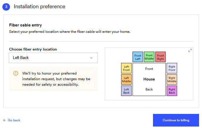 - Use the dropdown menu to select your preferred fiber entry point (the area where the line should come into your home).