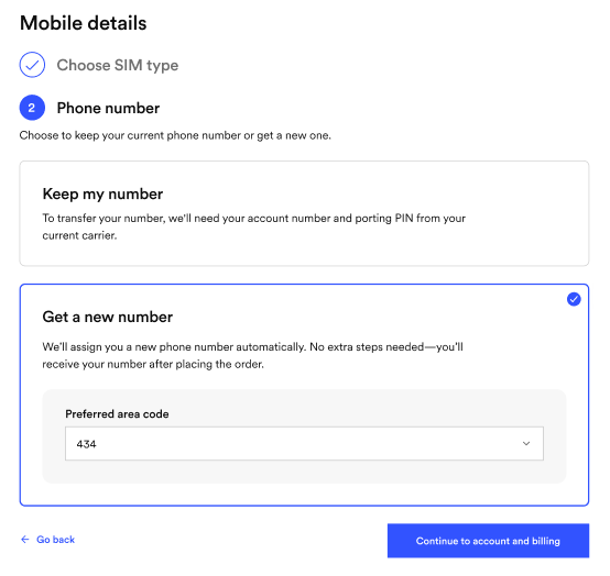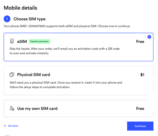 - If your phone is eSIM compatible, you can select the option for eSIM. We'll send you an email with the details after activation.